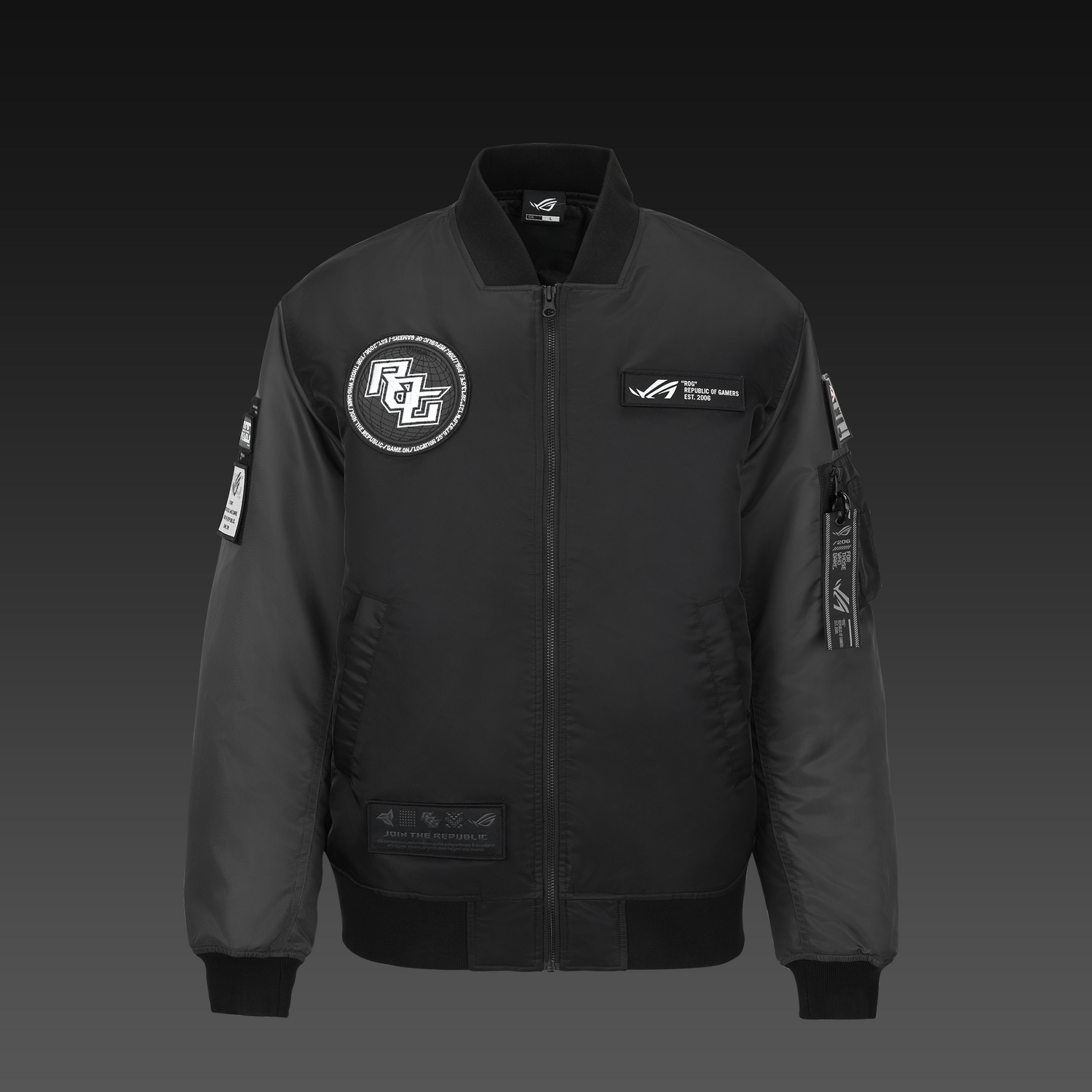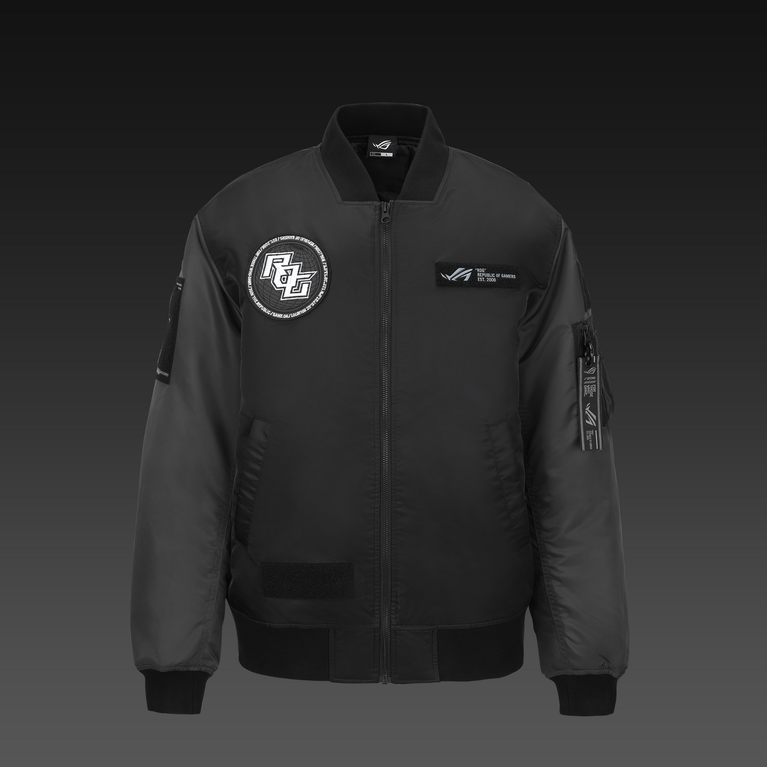 ROG Cosmic Bomber Jacket är designad för att återspegla din personliga stil genom sex utbytbara grafiska etiketter, vilket betonar ROGs fokus på anpassning och individuellt uttryck. Etiketterna är placerade på framsidan och ärmarna, vilket gör att du kan skapa din egen spelestetik.