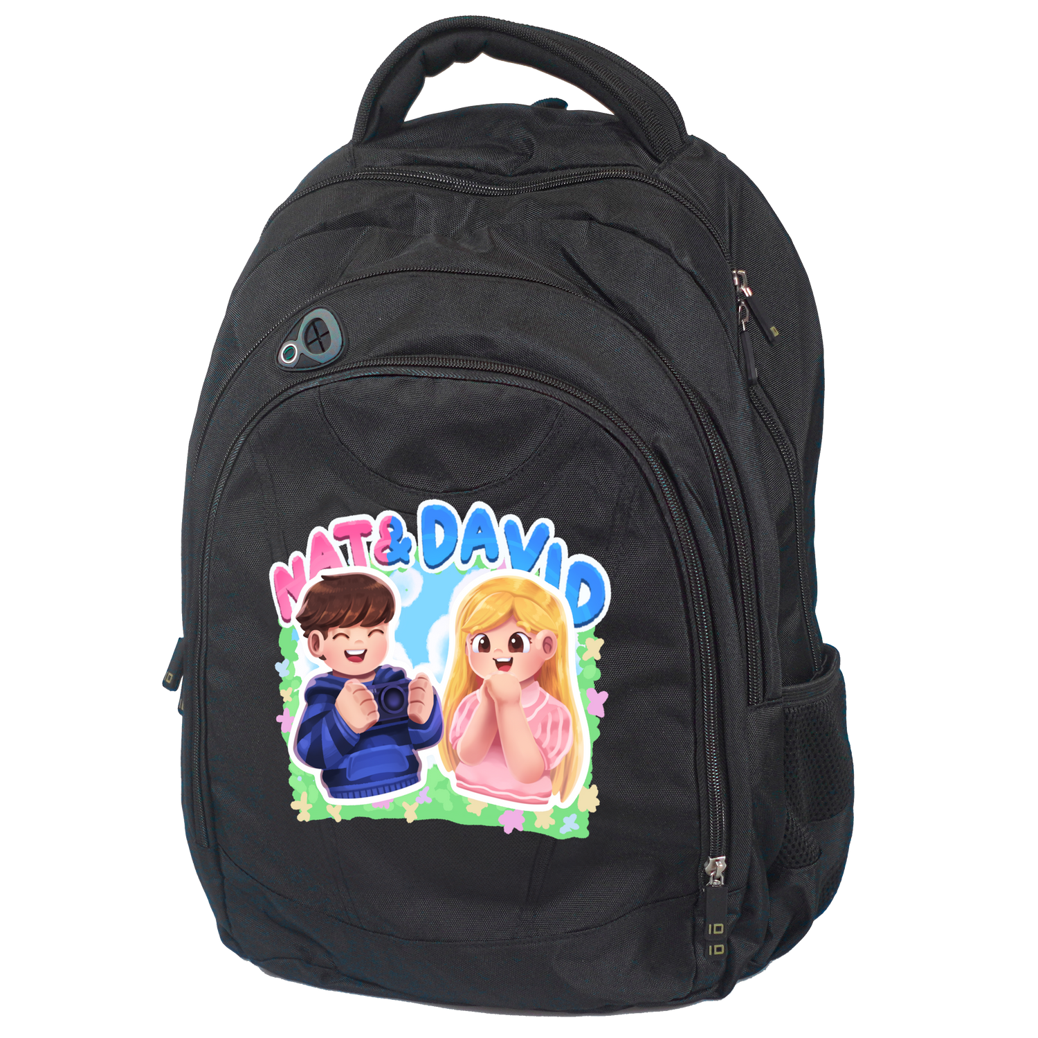 Med denna skolväska blir du en del av Nat&David -gemenskapen. Perfekt för både skolan och fritiden, så att du kan ta med dig deras energi och humor överallt!