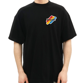 På fronten får du et diagonalt Betacritic-logo i et farvesplash af rød, gul, orange og blå. Designet giver tydelige associationer til både retro-TV-æraen og moderne streaminggrafik – uden at råbe for højt. Bagsiden? Holdt helt sort og ren for et afbalanceret look.