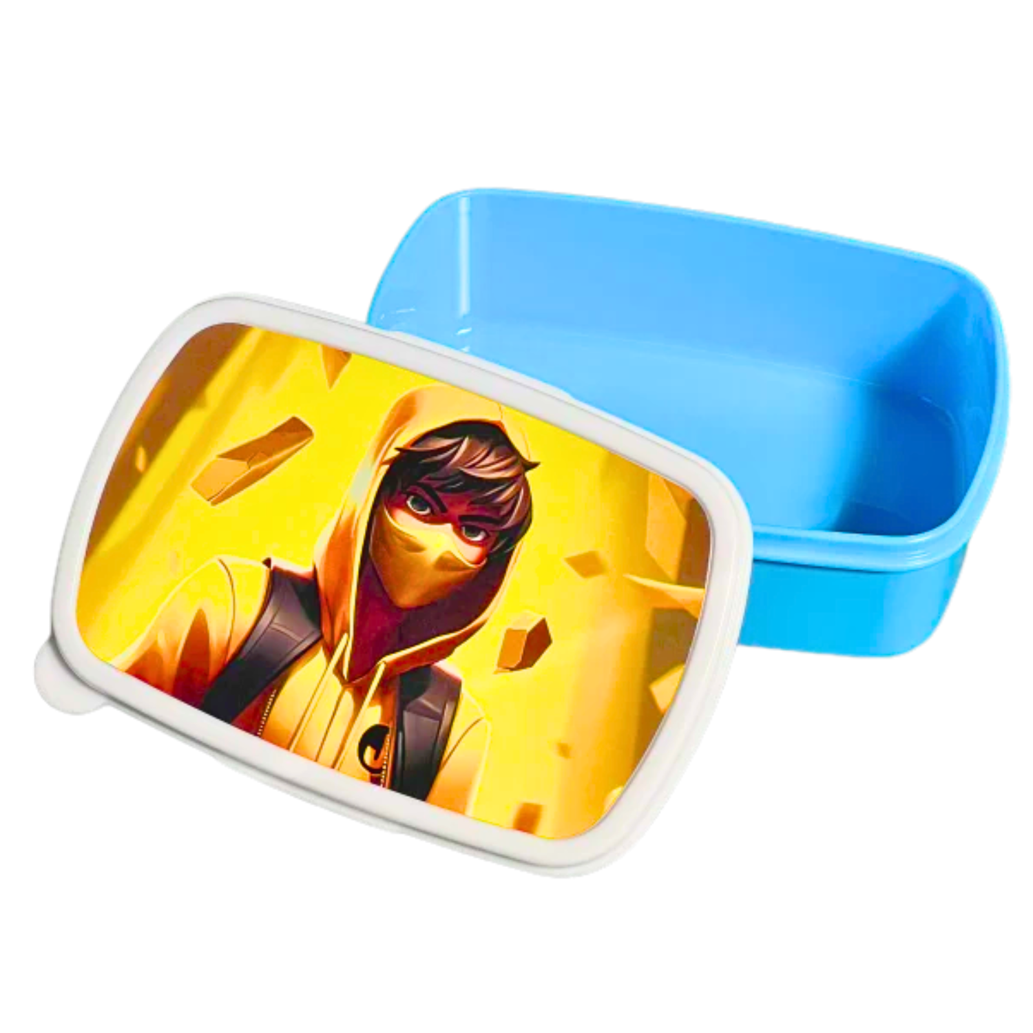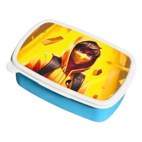 GoldenJ Madkassen kombinerer et episk design i guld og gult med praktisk funktion, så du kan nyde din mad med stil. Med det ikoniske motiv af GoldenJ i hættetrøje og maske – omgivet af gyldne blocks – er denne madkasse et must-have for enhver Fortnite-fan!