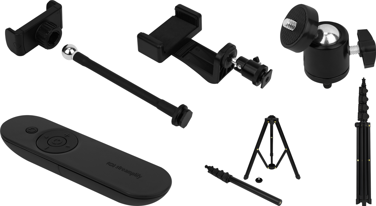Om du foretrækker at bruge et streamingkamera eller din smartphone, er op til dig med dette ringlys. To kamerakuglebeslag i forskellige størrelser og et smartphonebeslag medfølger. Smartphone-beslaget er kompatibelt med enheder med en bredde på 76 millimeter.