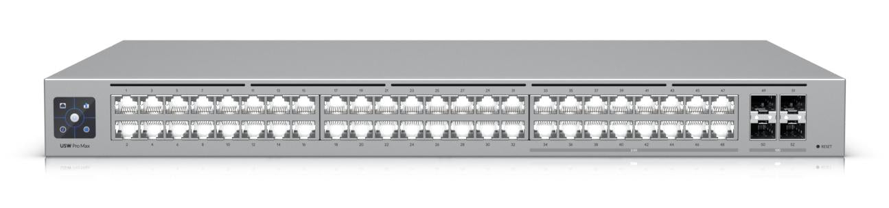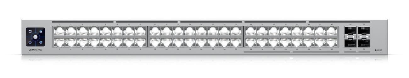 Ubiquiti Pro Max 48. Switch lag: L3. Basis omskiftning RJ-45 Ethernet porttype: 2.5G Ethernet (100/1000/2500), Basis omskiftning RJ-45 Ethernet porte, antal: 48. Switch kapacitet: 224 Gbit/sek.. Netværksstandarder: IEEE 802.1x. Strømstik: Vekselstrøm/jævnstrøm. Stativ-montering, Formfaktor: 1U