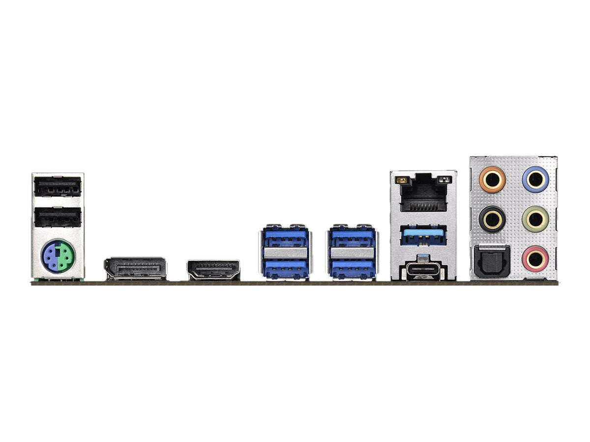 Interface bagpanel 1 x PS/2 tastatur/mus, 1 x LAN (Gigabit Ethernet), 1 x TOSLINK, 1 x DisplayPort, 1 x HDMI, 2 x USB 2.0, 4 x USB 3.1 Gen 1, 2 x USB 3.1 Gen 2 (Type-A og Type-C), 1 x audio linje-ind (mini-jack), 1 x audio linje-ud (mini-jack), 1 x mikrofon (mini-jack)