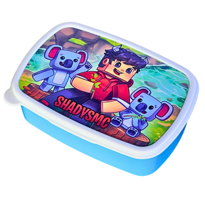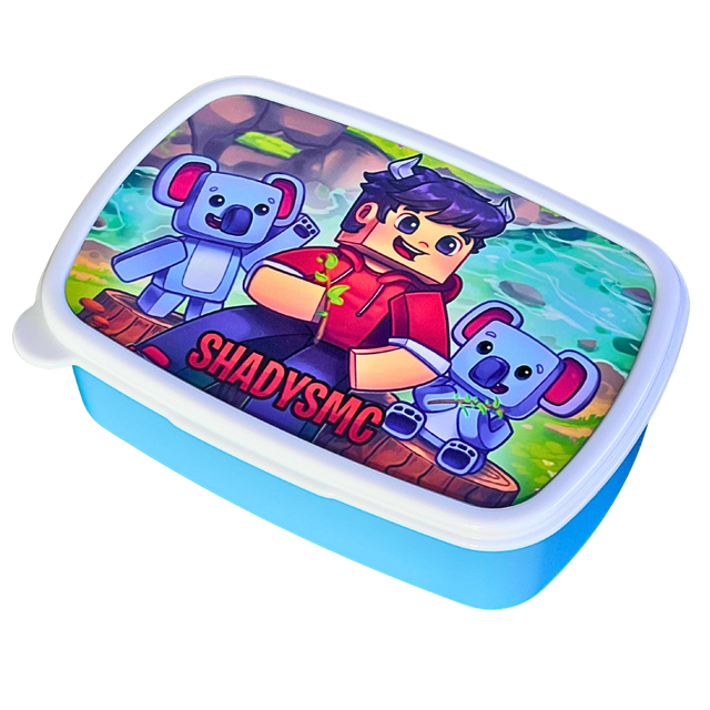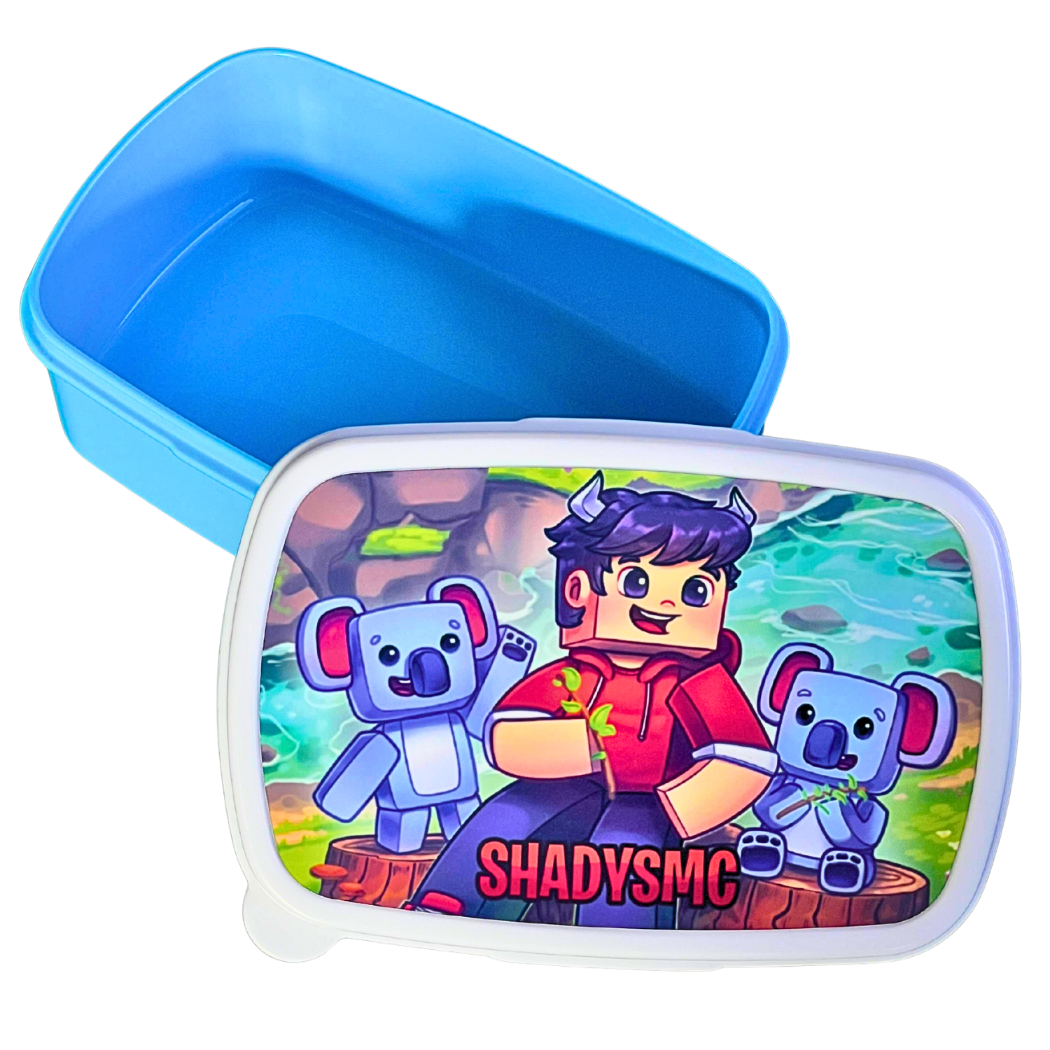 Madkassen har en frisk cyan base og et hvidt låg med et charmerende Koala-print fra Shadys. Den er nem at åbne og lukke, og størrelsen passer perfekt til mindre måltider og snacks.