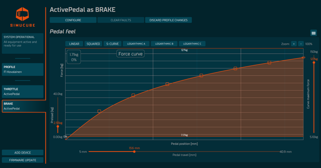 Glem alt om udskiftning af fjedre, dæmpere og pedalarme. Med ActivePedal konfigurerer du alt i Simucube TrueDrive-software, hvor du kan ændre: