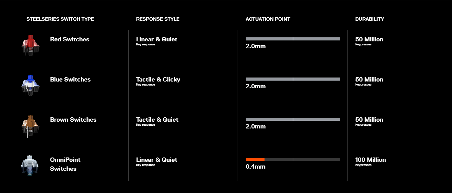 Tangentbordet har en okrossbar aluminiumlegeringsram för exceptionell hållbarhet. Ramen har OmniPoint justerbara mekaniska brytare som låter dig justera aktiveringsavståndet för varje tangent från 0,4 mm till 3,6 mm.